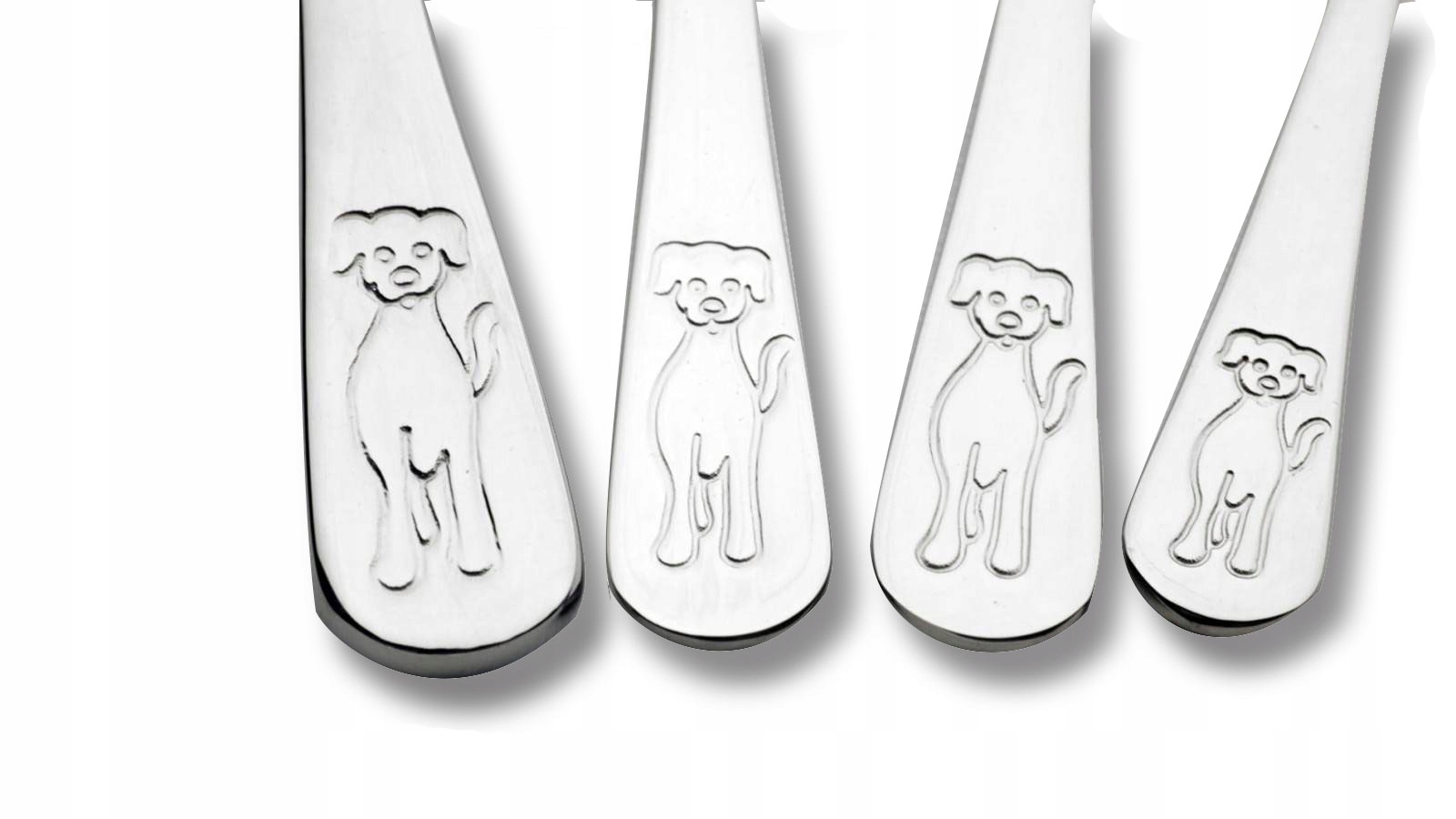 ZESTAW SZTUĆCÓW DLA DZIECI Poszukujesz upominku odpowiedniego z okazji Chrztu lub urodzin dziecka? Zestaw grawerowanych sztućców marki GERLACH będzie niezapomnianym, praktycznym i trwałym prezentem. W zestawie znajdują się wysokiej jakości sztućce takie jak: widelec, nóż, łyżka oraz łyżeczka. Każdy ze sztućców ozdobiony lubianym przez dzieci pieskiem.Ulubiony zwierzak doda apetytu małemu konsumentowi. Dodatkowo na każdym ze sztućców możemy wykonać wybrany przez Ciebie grawer - np imię dziecka, datę urodzin ... Taki zestaw będzie doskonałym prezentem dla każdego dziecka.