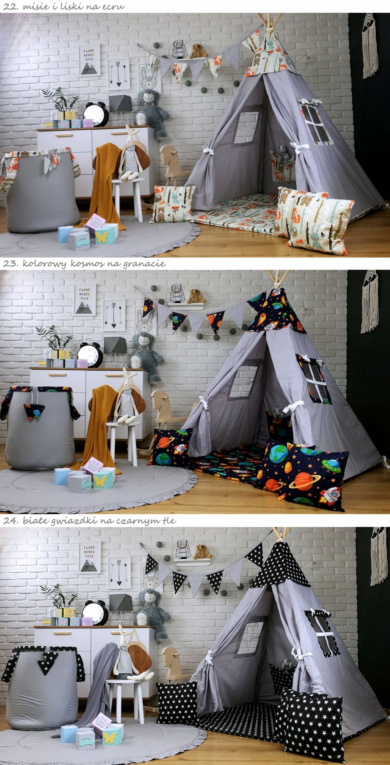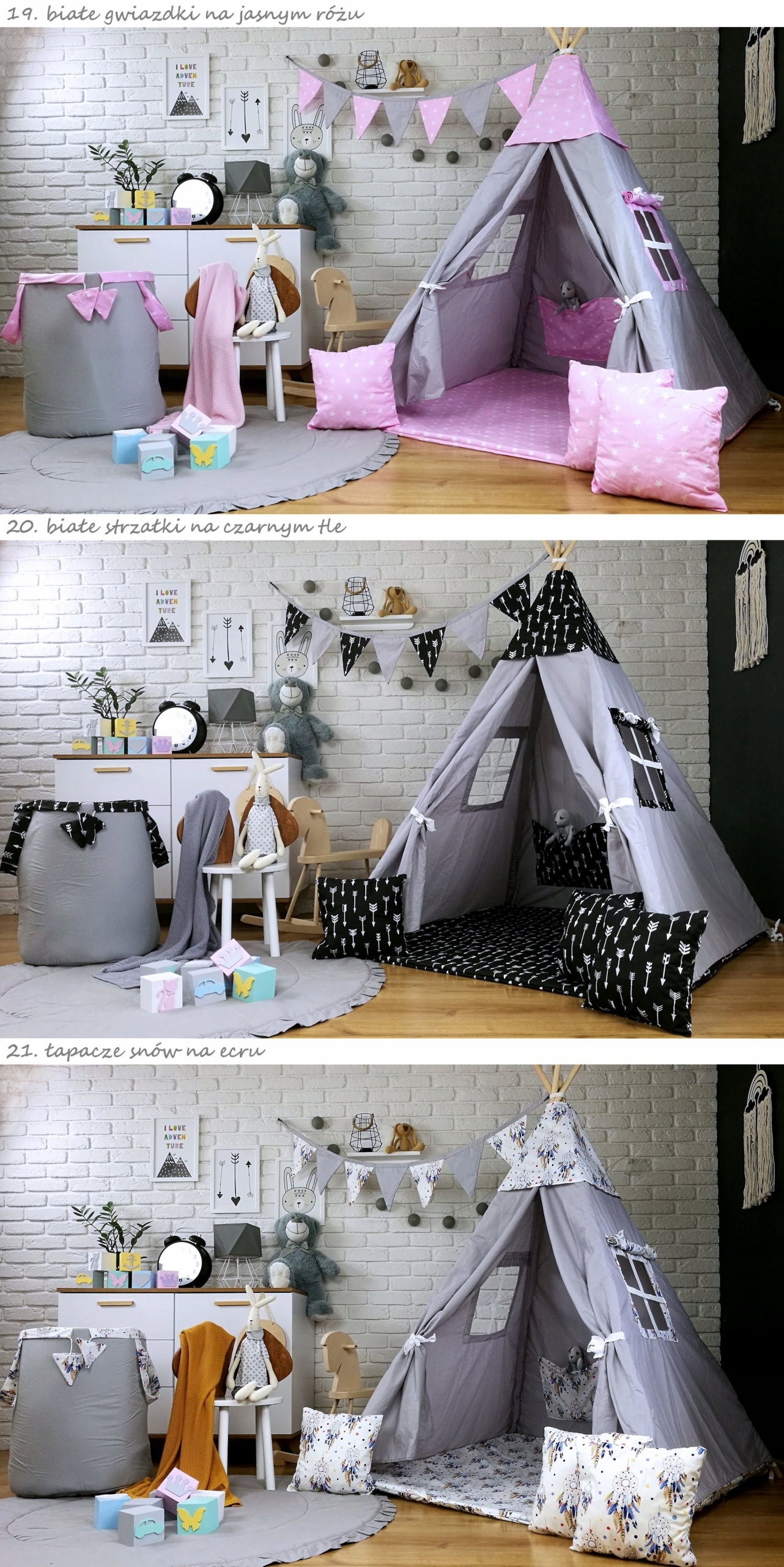 Namioty teepee można skompletować z innymi produktami naszej marki takimi jak pościel, kosz na zabawki i girlandy dzięki którym stworzysz oryginalną aranżację pokoju dziecka.