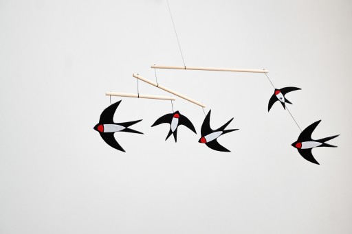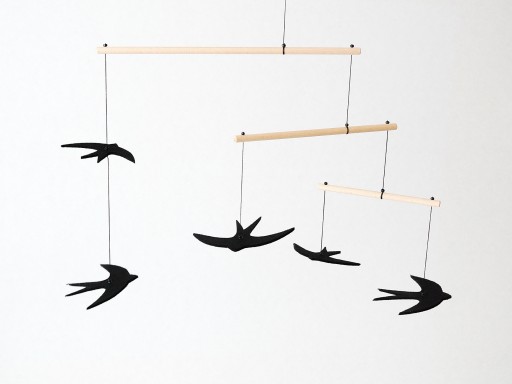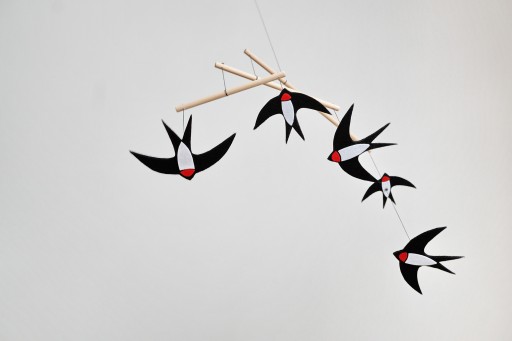 Мобільний Яська складається з п’яти ластівок, яких ми можемо зустріти навесні та влітку в наших околицях. Фетрові ластівки були виготовлені в різних розмірах, щоб допомогти дитині зрозуміти масштаб предметів, а додавання червоних деталей змушує дитину спостерігати за мобільним телефоном із ще більшим інтересом.