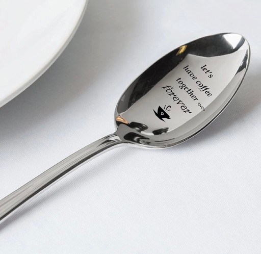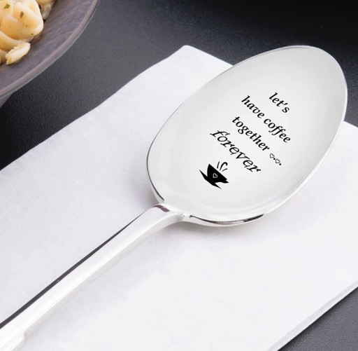 - Ця високоякісна ложка вигравірувана на стандартній промисловій гравірувальній машині як "Пиймо каву разом назавжди", тому враження залишиться назавжди.