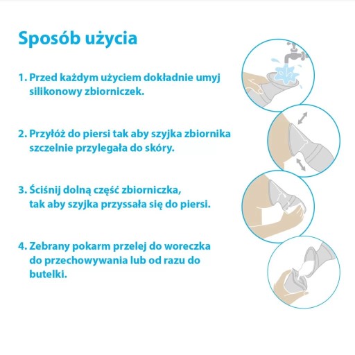 Молоковідсмоктувач виготовлений з м'якого безпечного силікону. Його форма нагадує воронку, з'єднану з невеликою водоймою. Перед використанням щільно стисніть молоковідсмоктувач, а потім прикладіть його до грудей так, щоб верхня частина щільно оточувала сосок. Коли ви відпускаєте молоковідсмоктувач, ви створюєте вакуум, який обережно всмоктує груди, імітуючи ніжне смоктання дитини. Таким чином не буде витрачено жодної краплі дорогоцінної їжі. Молоковідсмоктувач - колектор настільки легкий, що вам не доведеться підтримувати його рукою. Це дає вам повну свободу правильно прикласти дитину до іншої груді. Після закінчення годування молоко з молоковідсмоктувача можна закрити щільною кришкою і поставити в холодильник або помістити в пакет і заморозити.