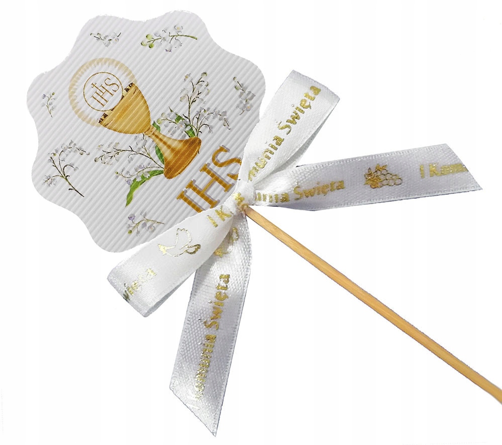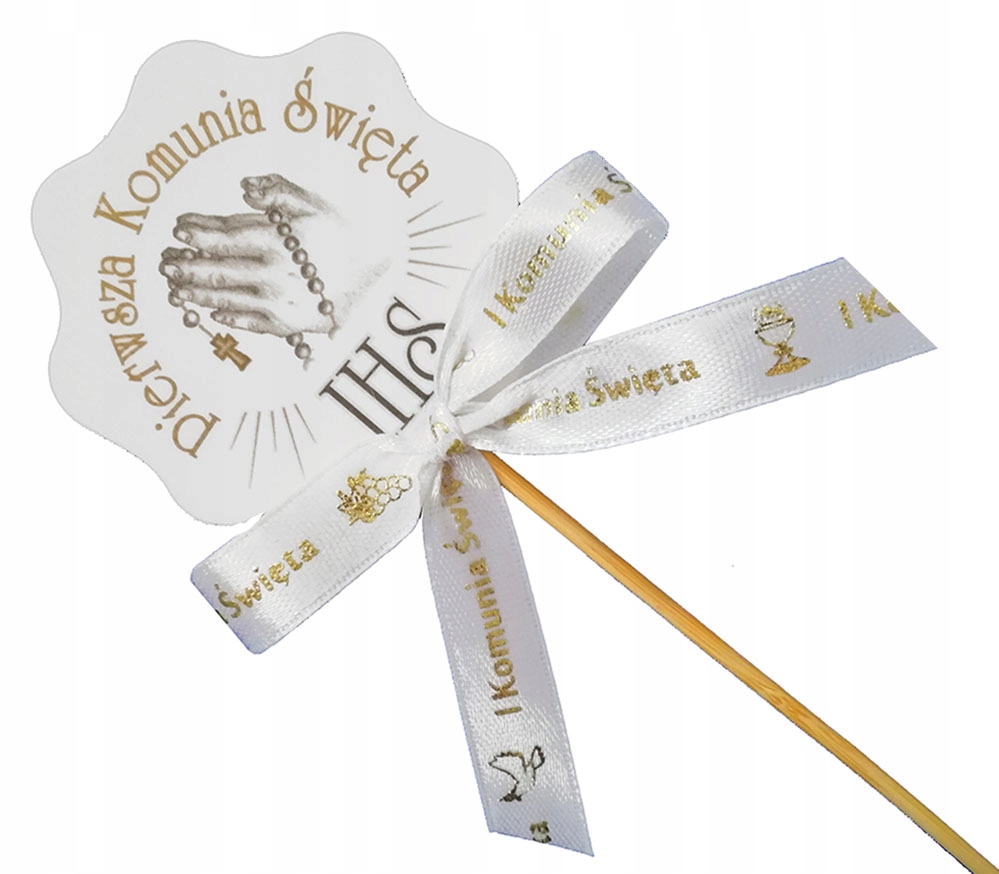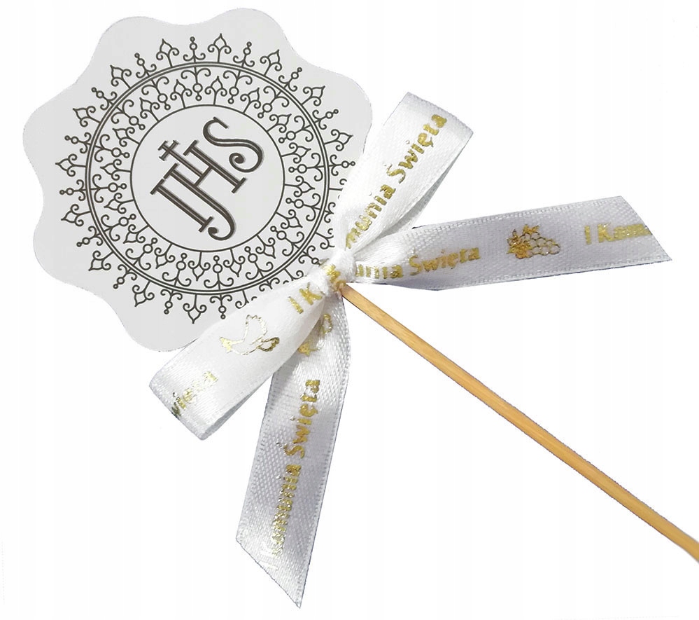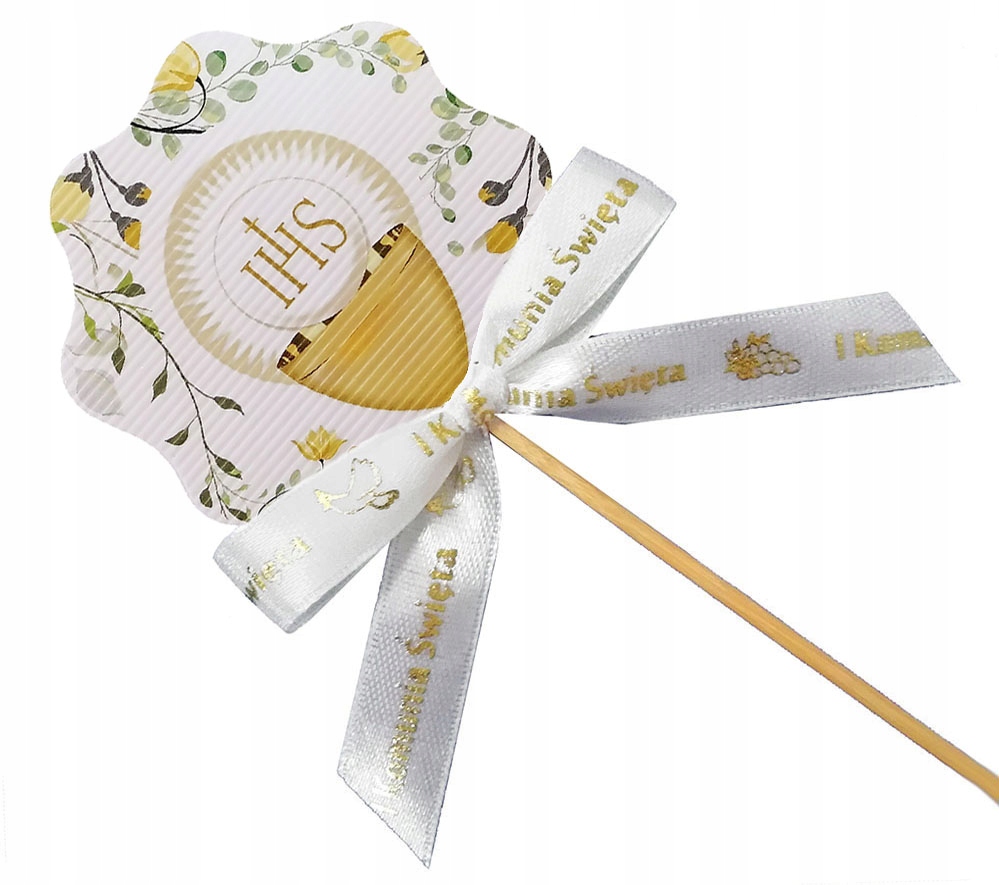 Wykonany z mocnego papieru i kokardki ze złotym nadrukiem. SUPER POMYSŁ jako dodatek do każdej dekoracji komunijnej.