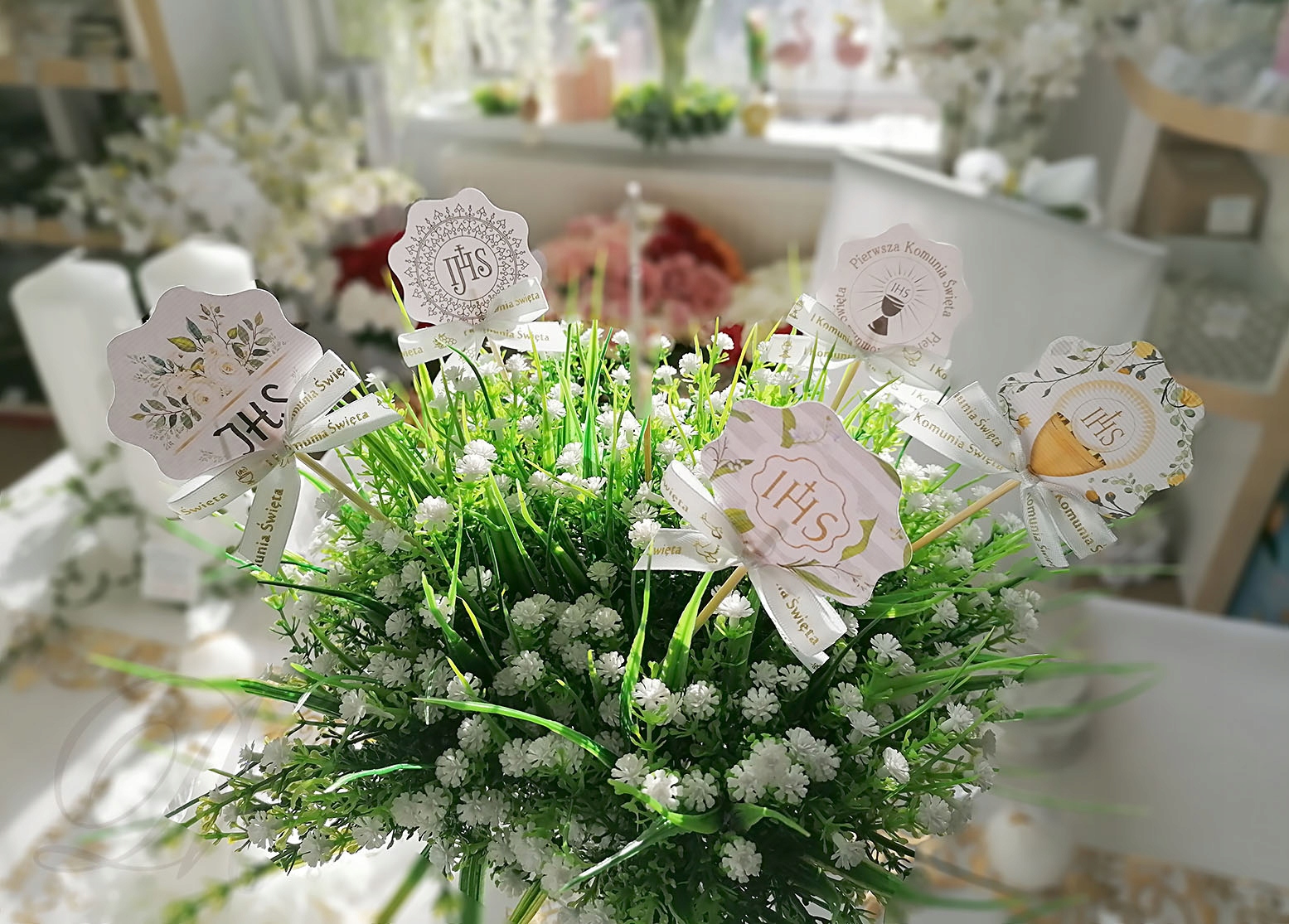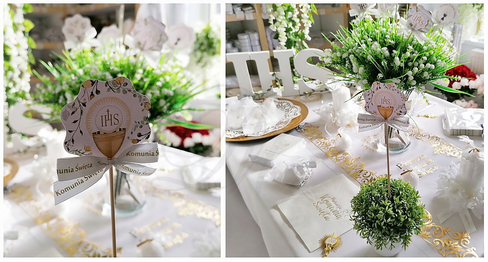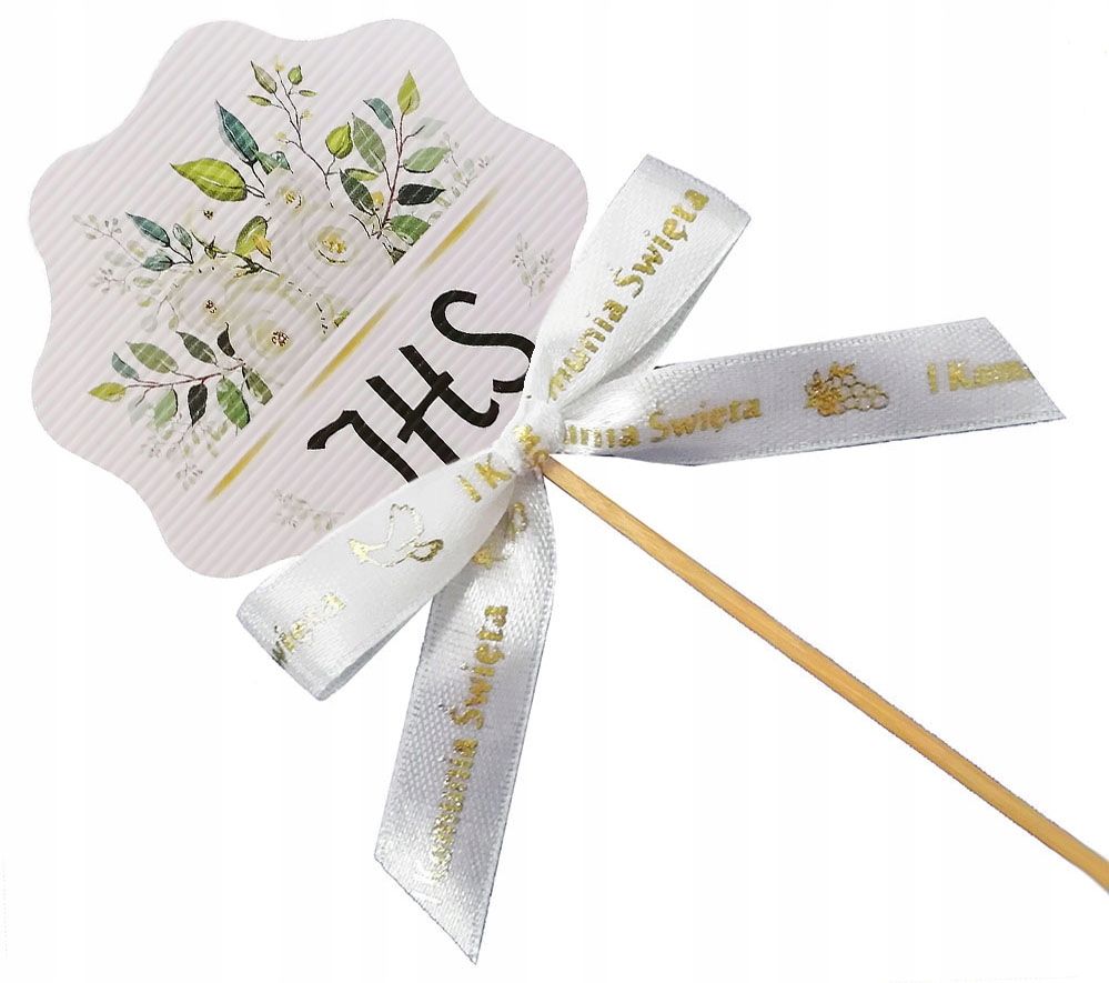 Wykonany z mocnego papieru i kokardki ze złotym nadrukiem. SUPER POMYSŁ jako dodatek do każdej dekoracji komunijnej.