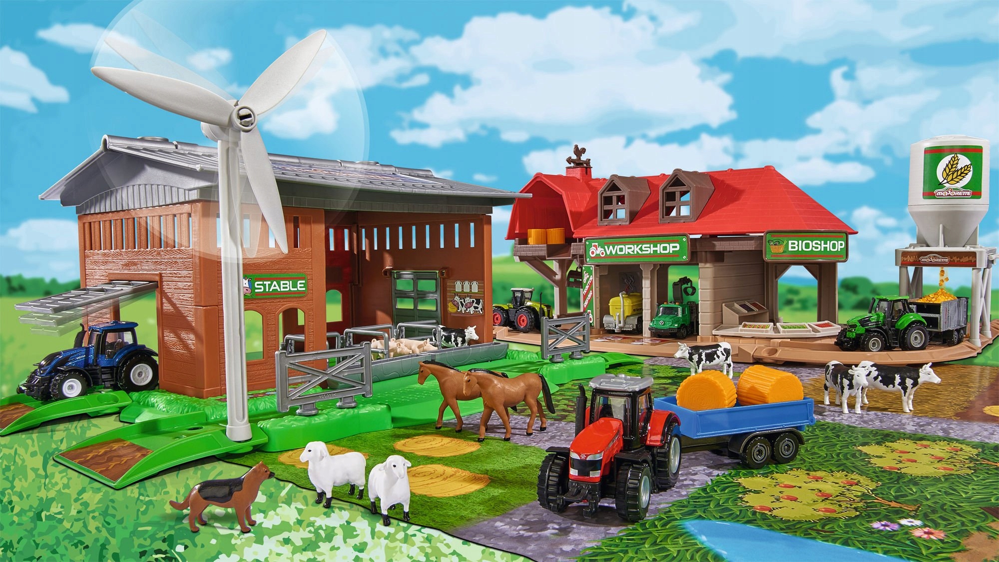 Na farmie mnóstwo się dzieje! Trzeba zająć się uprawą warzyw w ogródku i ich sprzedażą, uprawą i zbiorem plonów oraz nakarmić zwierzątka: świnki, krówki, owce i konie i psa. Wspaniały warsztat połączony ze sklepikiem ze zdrową żywnością, obora z otwieranymi drzwiczkami i dachem, wiatrak oraz zbiornik na zboże sprawią, że dziecko poczuje się jak na prawdziwej urokliwej wsi.