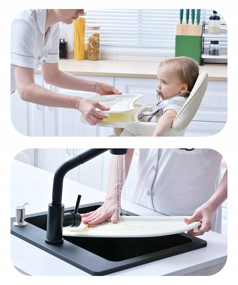 regulowany 3 stopniowy blat ze zdejmowaną tacką zapewnia komfort w próbach samodzielnego jedzenia.