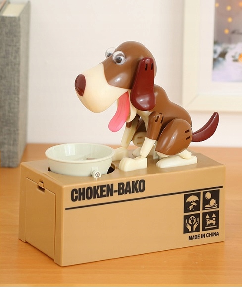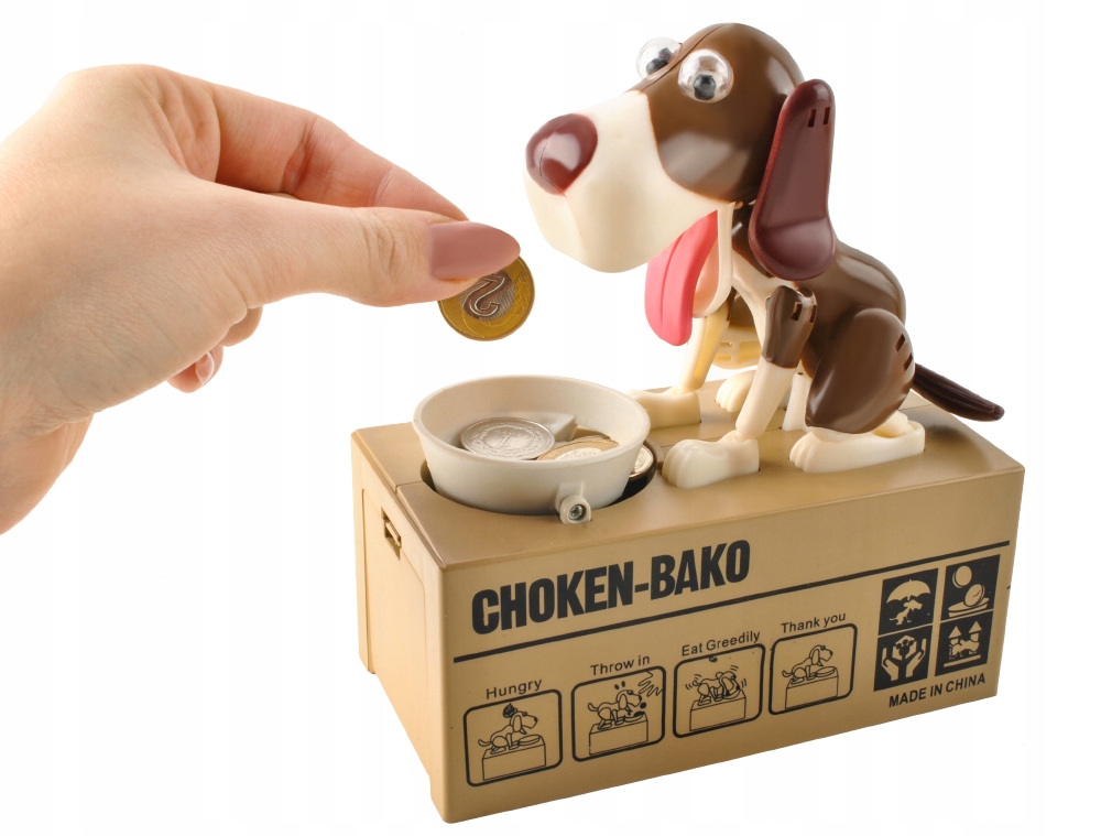 Wystarczy włożyć monetę do miseczki znajdującej się przed pieskiem i pod wpływem nacisku na czujnik piesek zaczyna reagować w taki sposób jakby jadł pokarm z miski powodując wsunięcie się monety do skarbonki. Podczas zrzucania monety cały piesek się porusza.