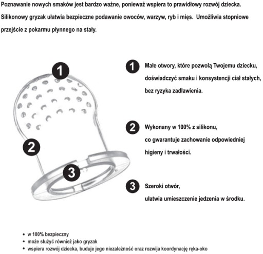 Знайомство з новими смаками дуже важливо, адже це підтримує правильний розвиток дитини. Силіконовий прорізувач дозволяє легко безпечно подавати фрукти та овочі. Це забезпечує поступовий перехід від рідкої їжі до твердої.
