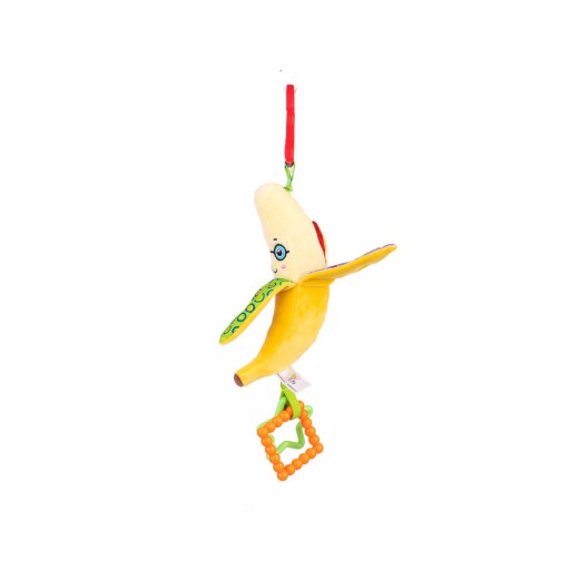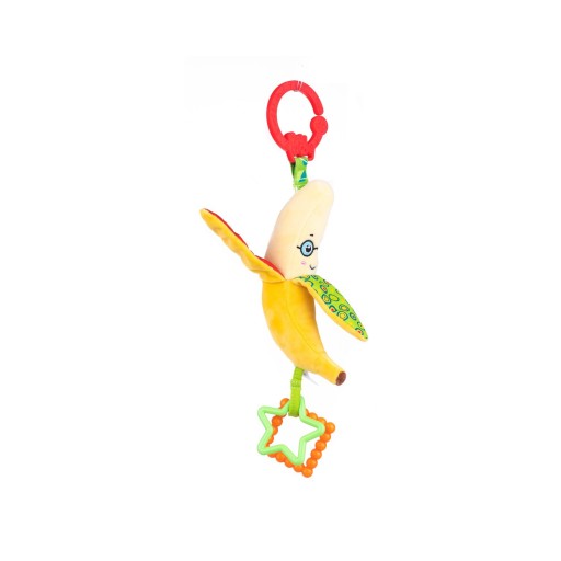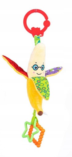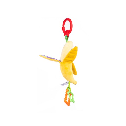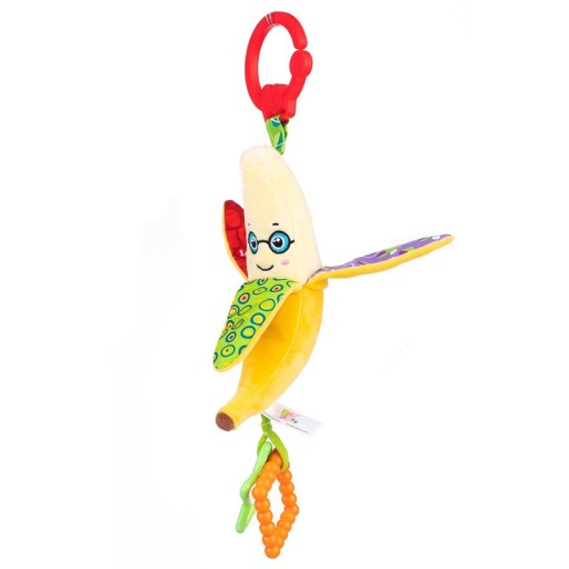 Фрукти та овочі додалися до родини Grumpy Plush! Розумний банан має елементи шелестіння та прикрашений двома різнокольоровими прорізувачами, які полегшать відрижку немовлят. Іграшка має практичну ручку, що дозволяє прикріпити її в обраному місці. Підвіска призначена для дітей з народження.