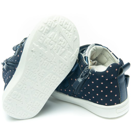 - Бічні частини верху прикрашені рожевими крапками та бантом перламутрового та темно-синього кольору.
