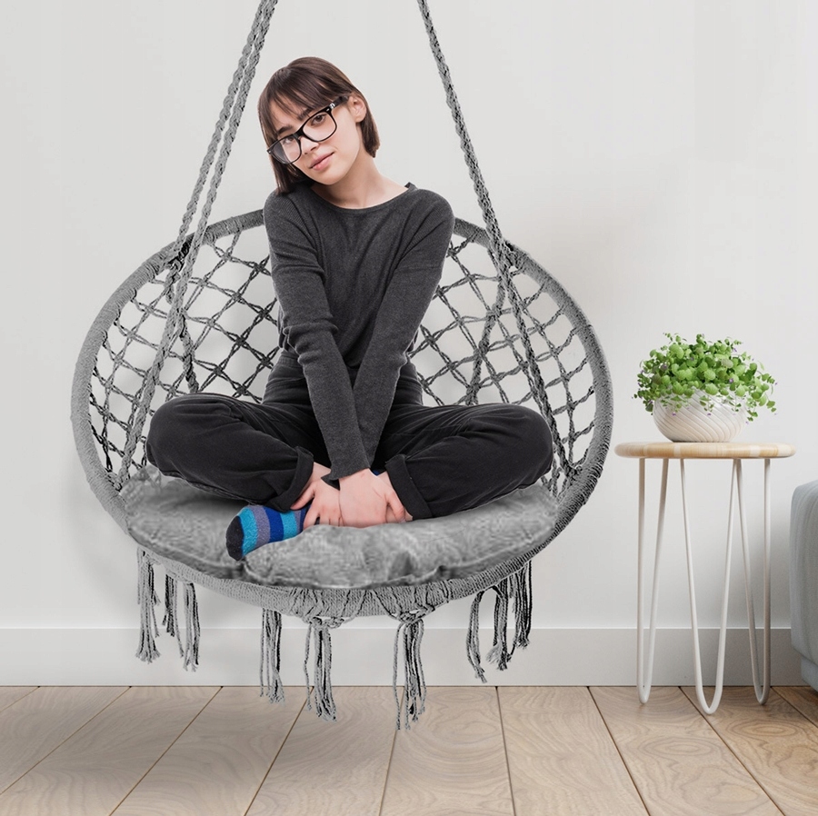 Huśtawka została zaprojektowana z myślą o komforcie, siedzisko mocowane jest na solidnych metalowych pierścieniach, które możesz zawiesić na specjalnych hakach, stelażach lub gałęziach. W dolnej części siedziska znajdują się ozdobne frędzelki nadające huśtawce niepowtarzalnego stylu. Siedzisko wykonane jest z wytrzymałej plecionej bawełny, odpornej na warunki atmosferyczne. Cały kształt fotela został zaprojektowany w taki sposób, aby zapewniał maksymalny komfort podczas odpoczynku. Delikatne bujanie i huśtanie z pewnością umilą naukę oraz czytanie książek.
