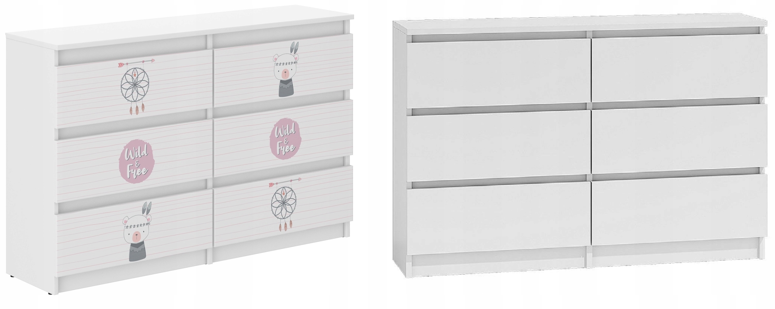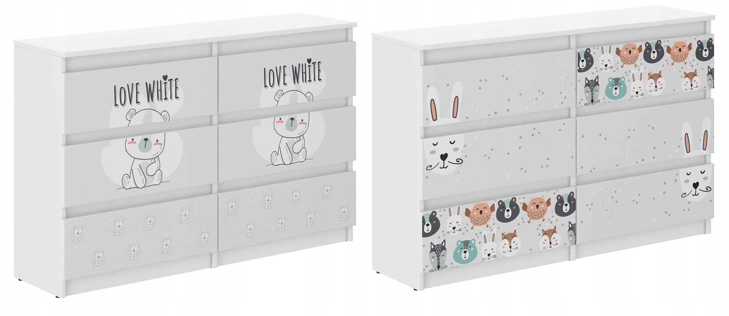 Nowoczesna komoda R-120 to praktyczny i funkcjonalny mebel, który znajdzie swoje zastosowanie w każdym pokoju dziecięcym. Ergonomiczne wymiary zapewniają swobodne umeblowanie pomieszczenia. Komoda wykonany jest z płyty wiórowej kolor biały, wykończony okleiną. Składa się ona z szejściu szuflad, zamocowanych na prowadnicach, które zostały wyposażone w ograniczniki aby zapobiec całkowitemu wysunięciu. Drzwi komody posiadają kolorowy nadruk, który ma ładne żywe kolory i jest zabezpieczony specjalnym laminatem aby nie uległ wyblaknięciu lub ścieraniu. Można bez obaw myć go ściereczką i płynem.
