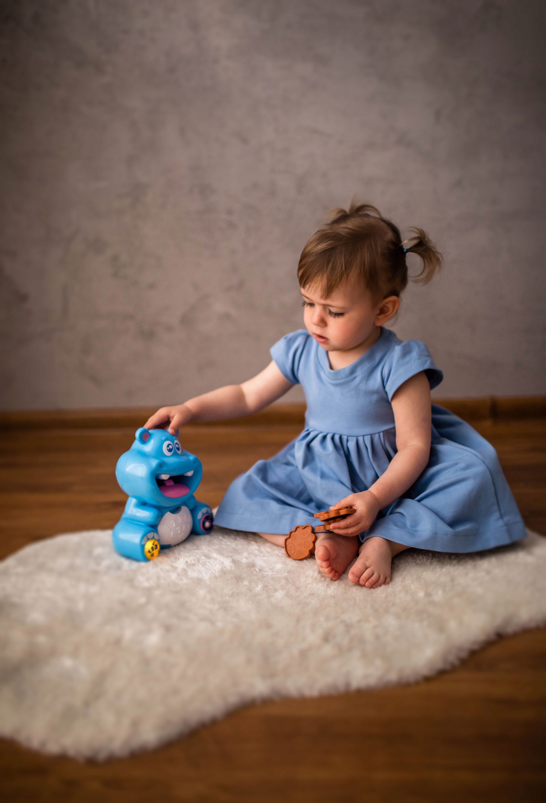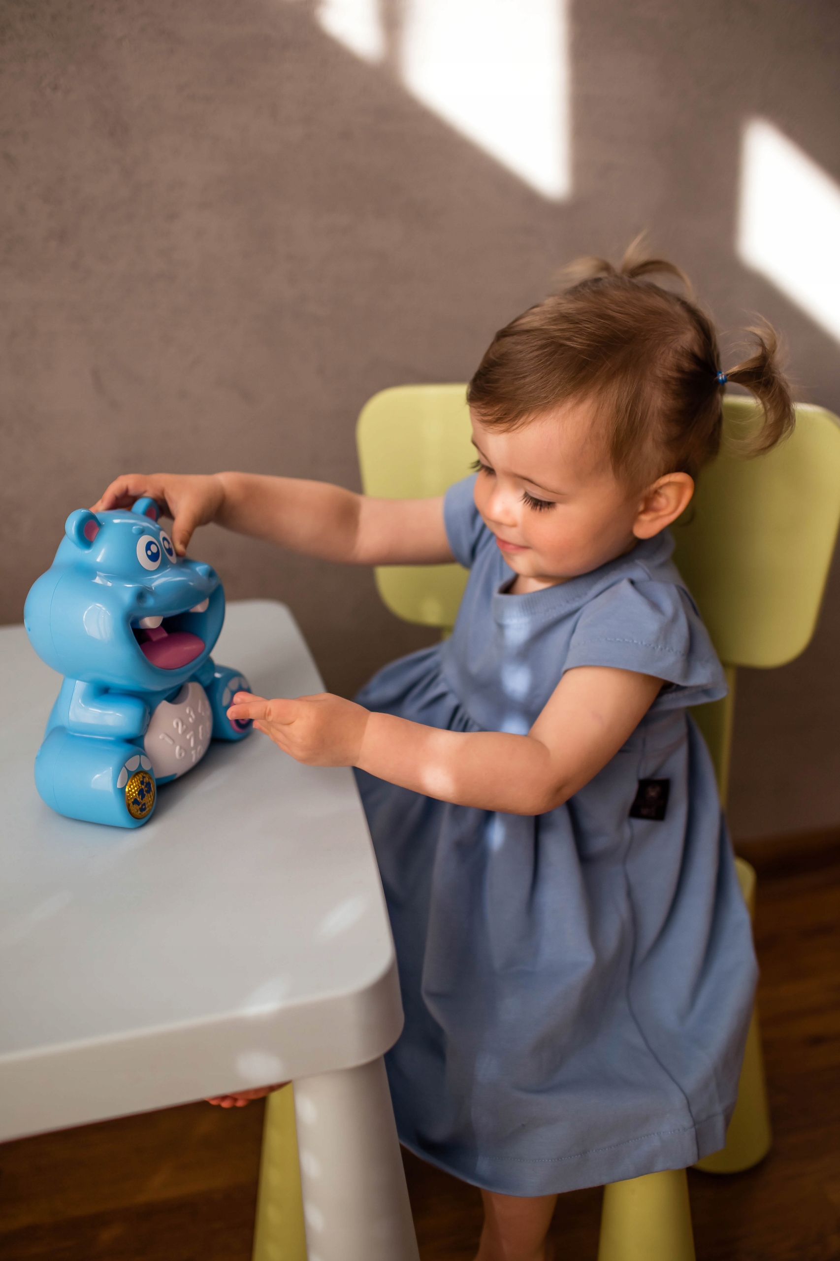 Kiedy dziecko naciśnie na stópkę rozpocznie zabawę w liczenie oraz usłyszy zabawne dźwięki i melodie. Nakarm hipcia i powiedz ile jest w stanie zjeść ciasteczek.
