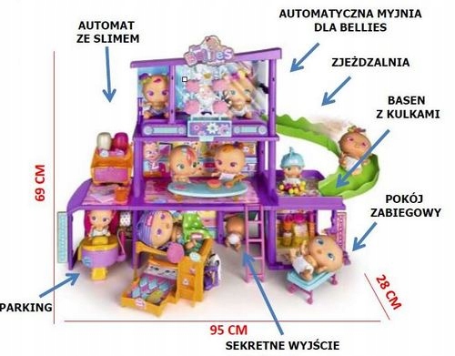 Zestaw zawiera bardzo dużą willę, składającą się z 7 pomieszczeń, m.in. kuchni, zjeżdżalni dla Bellies, parkingu, myjni, która naprawdę się rusza, automatu ze slimem, basenu z kulkami i wielu innych. W opakowaniu znajduje się również 15 akcesoriów do urządzenia willi.