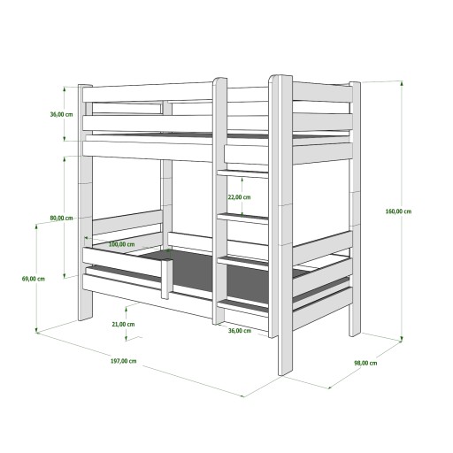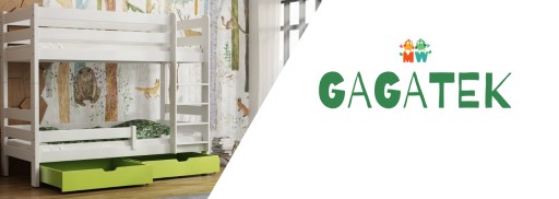 GAGATEK - це двоповерхове ліжко, повністю виготовлене з високоякісної сосни. Він ідеально підходить для кімнати братів і сестер, коли вам потрібно оптимально використовувати простір, який поділяють ваші діти. Захисні дерев'яні поручні запобігають падінню, а діти можуть безпечно та зручно підійматися по драбині з плоскими щаблями. Також можливе використання версії GAGATKA з двома незалежними петлями. колесо, яке можна складати та розбирати багато разів, без шкоди для його міцності та естетики