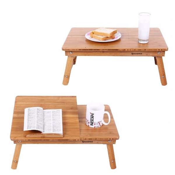 Stolik został wyprodukowany z eleganckiego drewna bambusowego i ładnie polakierowany, dzięki czemu ładnie wygląda i wpasuje się w każdy wystrój pomieszczenia. Wykończenie jest bardzo staranne, idealnie wypolerowany - nie posiada żadnych ostrych krawędzi. Wymiary powierzchni roboczej pozwalają na ustawienie laptopa do około 15-16 cali i dodatkowo np. kubka z napojem, telefonu, kalkulatora lub notatnika z długopisem. Poniżej szczegółowo opisujemy poszczególne funkcję stolika. Polecamy!