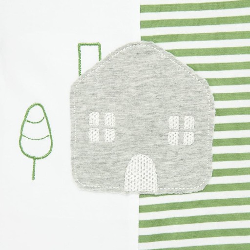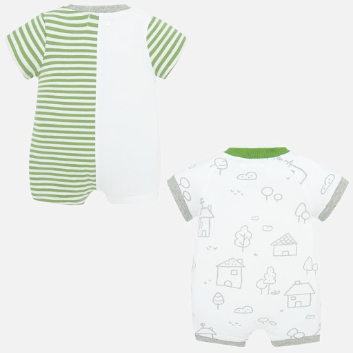 Піжама з коротким рукавом для новонароджених. Круглий виріз. Застібається на невеликі застібки на обох плечах, що сприяє швидкому та зручному одяганню. Застібається на застібки в промежині. Ніжна та еластична бавовна.