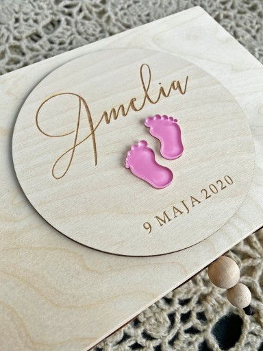 Спереду коробка прикрашена гравіюванням з ім'ям дитини, датою народження та рожевими ніжками. (велосипед - для дівчат або синій - для хлопчиків)
