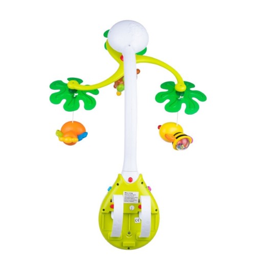 Барвистий мобіль, музична скринька та лампа 3-в-1 забезпечать вашій малечі чудові розваги вдень і міцний сон вночі. Рука, що знімається, прикрашена зеленим листям, на кожному з яких висить окрема гримуча тварина. Ці підвіски знімаються, тому їх також можна використовувати як ручну іграшку для малюка. Світловий і звуковий модуль відповідає за активацію окремих функцій: рух каруселі, лампа, що змінює колір, заспокійливі звуки природи і мелодії. Мобіль має регулятор гучності, тому його можна налаштувати під потреби малюка. Регульовані ремені кріплення дозволяють прикріпити модуль і карусель до ліжечка малюка.