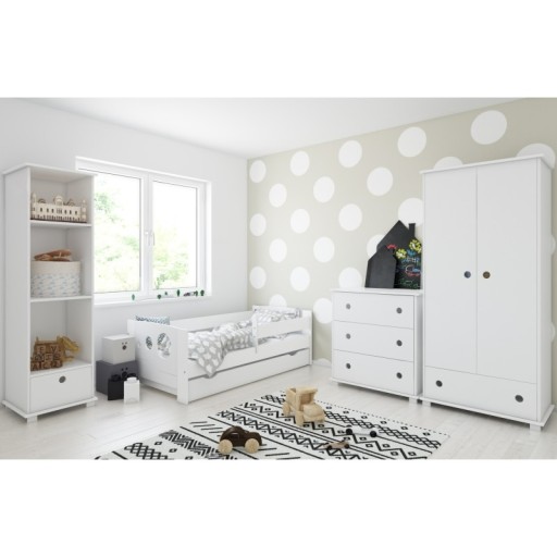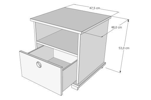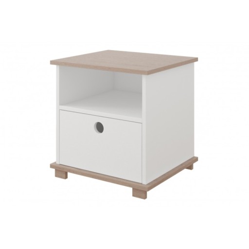 Все це легко поміститься на дитячій тумбочці KOLKA. Крім поверхні зверху (ідеальна для світильника), має зручну поличку, а додатково висувний ящик з ручкою - отвором у формі кола.