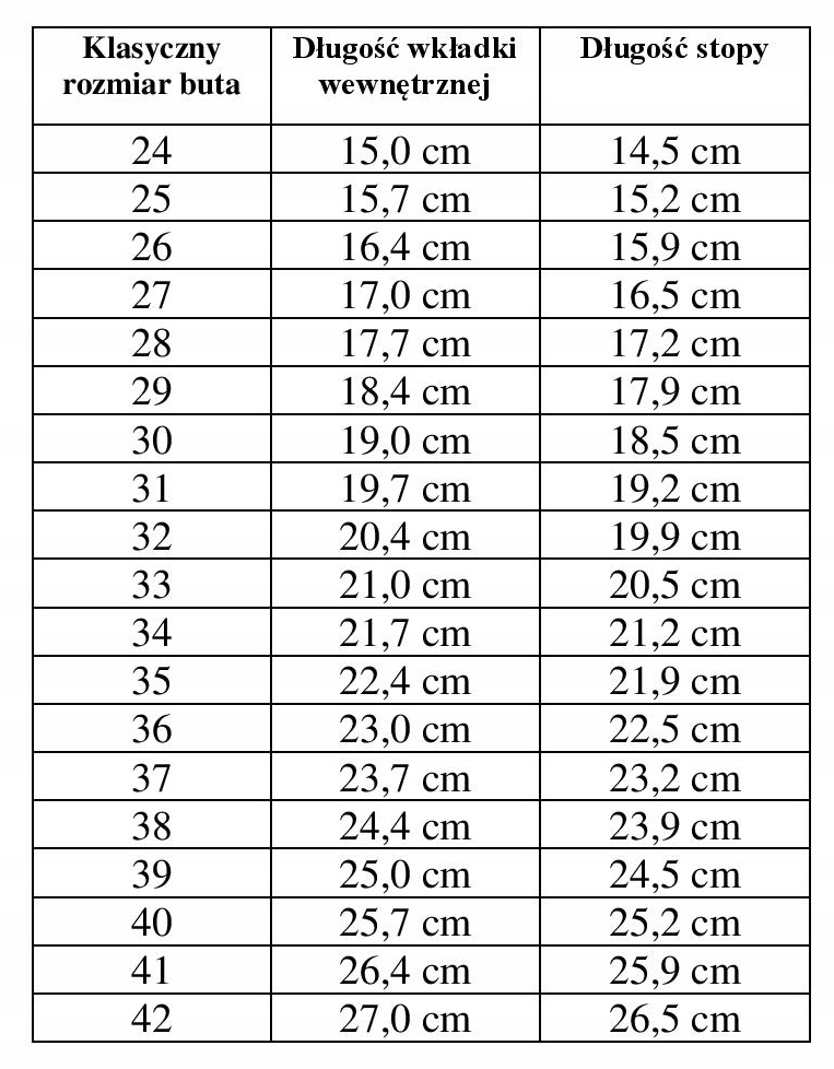 W tej aukcji proponujemy ROZMIAR 38 czyli długość wkładki 24,4cm dla długości stopy 23,9cm.