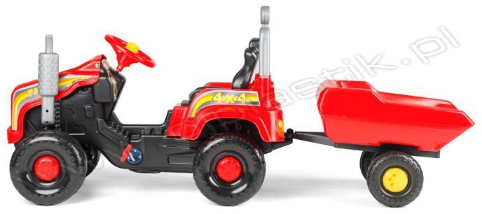 TRAKTOREK POSIADA NAPĘD NA PEDAŁKI ( Z MECHANIZMEM ŁAŃCUCHOWYM ) ORAZ SKRĘTNĄ KIEROWNICĘ, ZA POMOCĄ KTÓREJ DZIECKO KIERUJE CAŁYM ZESTAWEM !!!!