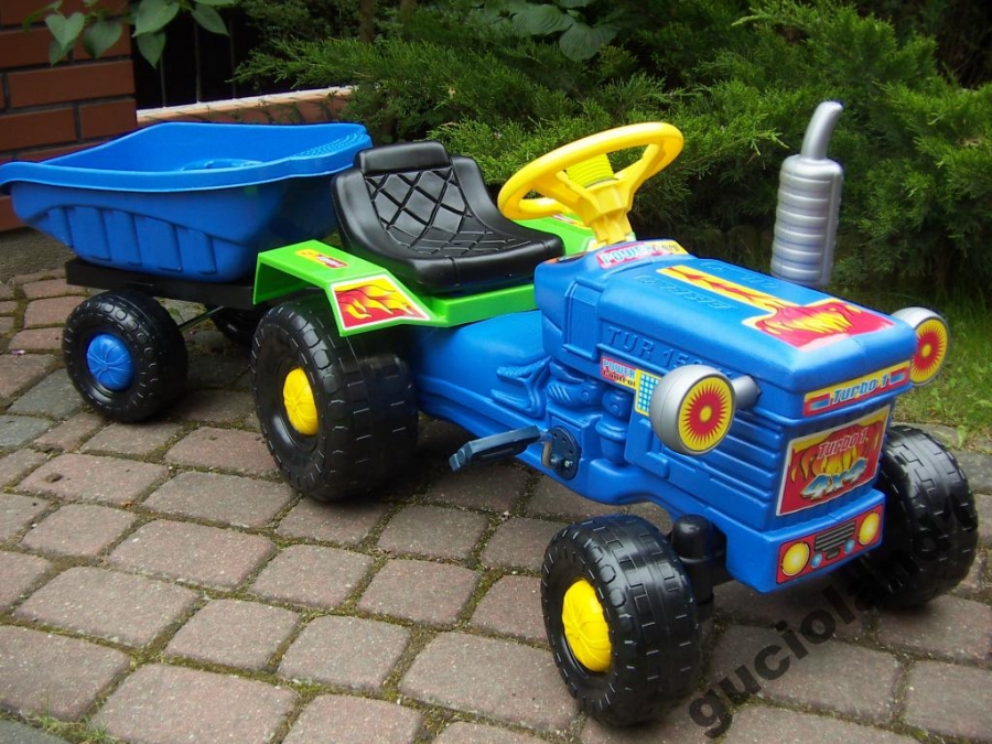 TRAKTOREK POSIADA NAPĘD NA PEDAŁKI ( Z MECHANIZMEM ŁAŃCUCHOWYM ) ORAZ SKRĘTNĄ KIEROWNICĘ, ZA POMOCĄ KTÓREJ DZIECKO KIERUJE CAŁYM ZESTAWEM !!!!