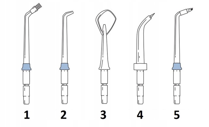- zestaw 7 specjalistycznych dysz: do kieszonek dziąsłowych, ortodontyczna oraz do usuwania płytki nazębnej