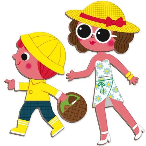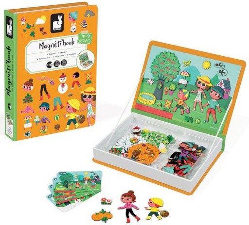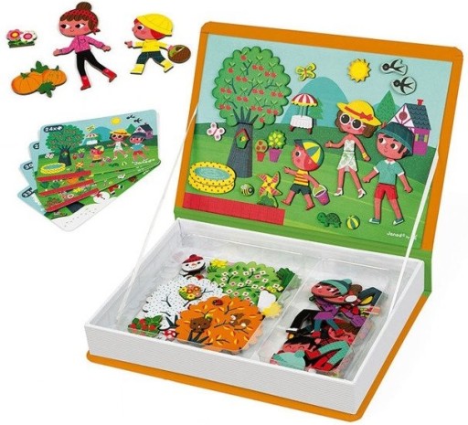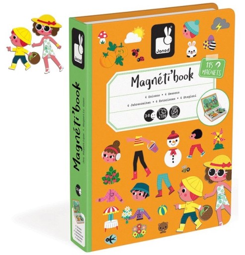 Magnetibook Seasons містить 115 різнокольорових магнітів з елементами, що зображують зміни, що відбуваються в природі (наприклад, квітучі дерева, пожовкле листя, сніговик) та одяг, що відповідає погоді, а також 4 картки з зразками картинок, які можна скласти з них.