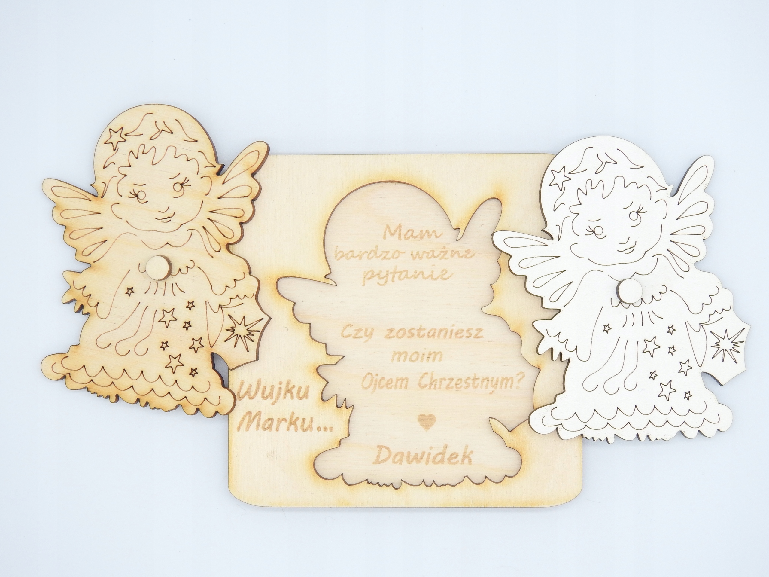 Drewniane tabliczki, które zostały przekształcone w postać prośby z indywidualnym grawerem to oryginalny sposób proszenia bliskiej osoby. Przede wszystkim to piękna pamiątka, przywołująca mimo upływu lat miłe wspomnienia osobie, która mogła towarzyszyć w tak ważnym dla Ciebie i Twojego dziecka dniu.
