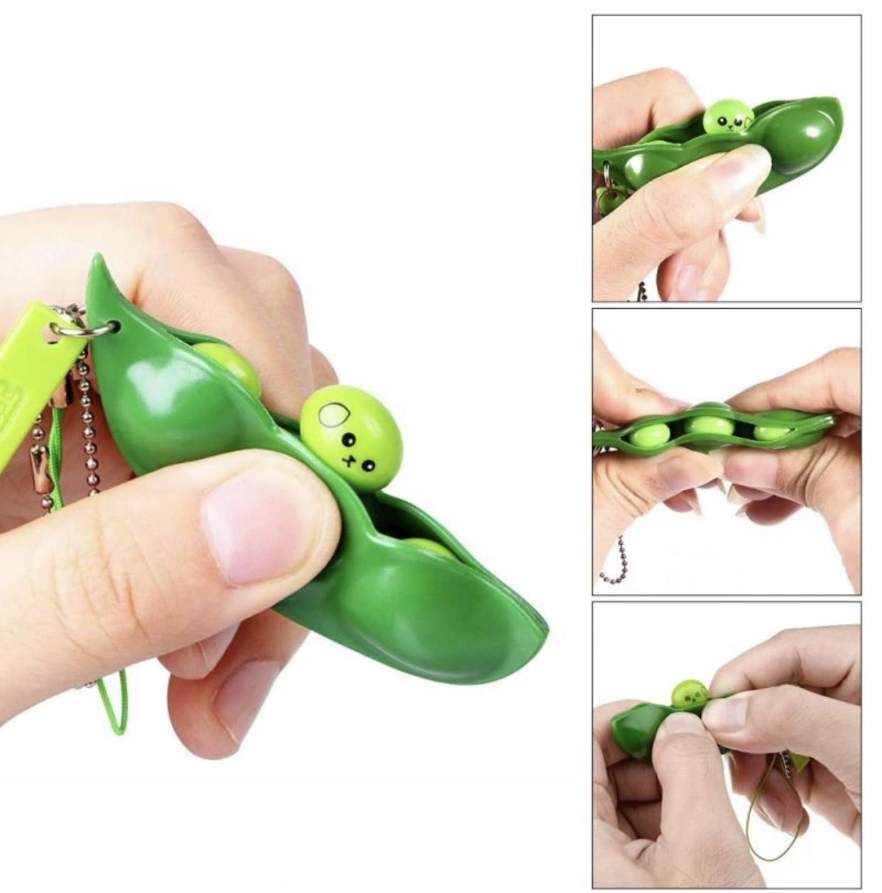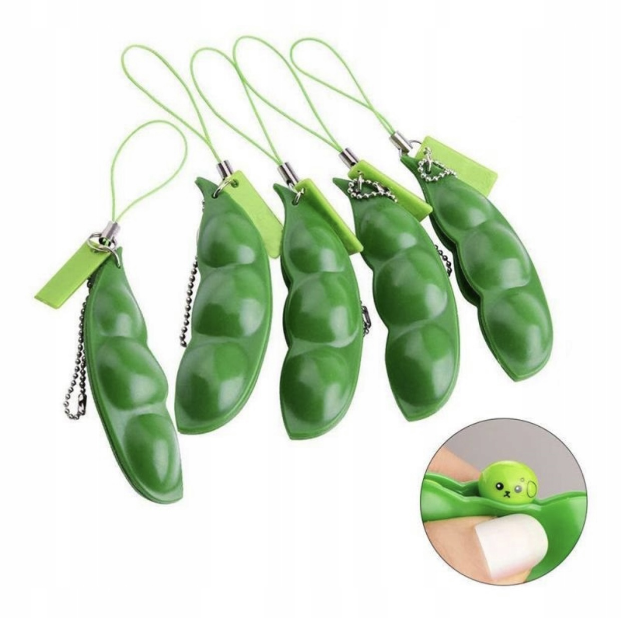 Breloczek z fasolkami to ciekawa zabawka sensoryczna zarówno dla dzieci jak i dla dorosłych. Strączek wykonany jest z rozciągliwej, elastycznej masy. Zabawa polega na wkładaniu i wyciskaniu fasolek ze strączka poprzez rozciąganie go. Fasolki również wykonane są z masy umożliwiającej ich swobodne rozciąganie.