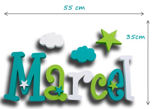 Розміри: перша буква приблизно 20 см, решта маленькі відповідно до пропорцій. Розмір всієї прикраси разом з декорами становить приблизно 55 см х 35 см. Товщина всієї прикраси приблизно 2 см.
