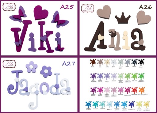 - Декори на вибір: метелик, сердечко, квітка, зірка, корона, машина, хмара, якір та літак (підбираємо кольори до вибраного малюнка букв). На кожне ім'я даруємо 3 безкоштовні прикраси.
