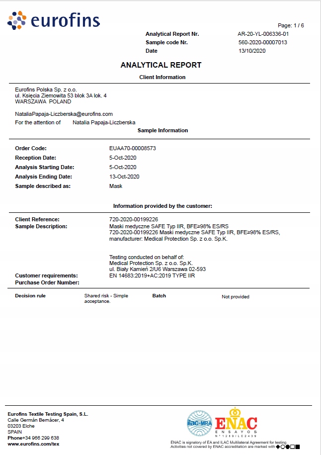 W trosce o Twoje bezpieczeństwo wszystkie materiały używane do produkcji masek medycznych SAFE® i SAFE TIME® dostarczane są przez certyfikowanych, sprawdzonych producentów posiadających wieloletnie doświadczenie w ich produkcji.