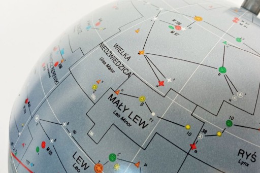На глобусі видно сузір’я. Позначено класифікацію спектрів зірок, їх типи, зоряні величини, знаки зодіаку та астрономічні об’єкти, відмінні від зірок (зоряні скупчення, галактики, туманності тощо).