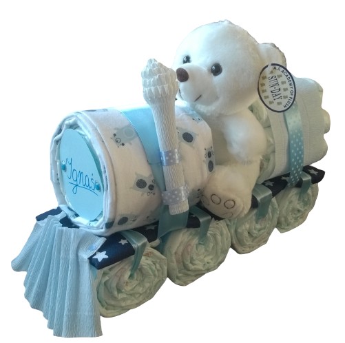 На цьому аукціоні ми пропонуємоторт з пелюшок - ПАРОВОЗ.Для цього м'якого,плюшевий Тедді, барвистийтетра і фланелеві пелюшки.