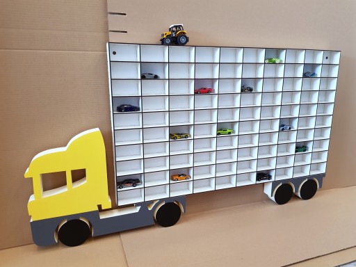 Автомобільна полиця має спеціальний виріз для дюбелів. Кабіну і колеса необхідно приклеїти до стіни двостороннім скотчем або монтажним клеєм.