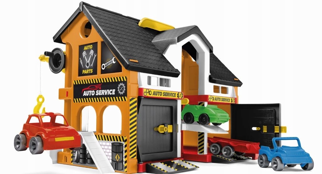 Play House Auto Serwis jest dwupiętrowym domkiem z wieloma ruchomymi elementami takimi jak otwierane drzwi, winda, dźwig. W zestawie znajdują się również trzy samochody, podjazdy oraz zestaw 34 naklejek do samodzielnego przyklejenia.