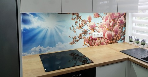 7) Чи можна використовувати панель ПВХ біля печі? Так. Ці панно для кухні ми друкуємо вже кілька років. Наші клієнти успішно використовують панелі, встановлені на кухні навіть з газовими плитами. Важливо, щоб панелі міцно приклеювалися до основи. Ми рекомендуємо клеїти панелі на двосторонній губчастий монтажний скотч і одночасно на силіконовий монтажний клей, наприклад, для дзеркал. Під час монтажу чергуйте вертикальні смуги стрічки та клею. Вам слід уникати ситуацій, коли панель безпосередньо контактує з вогнем, наприклад, не ставте великі каструлі на конфорки поруч із панеллю та ввімкніть газ до повного розігріву. Рекомендована відстань від конфорки до панелі не менше 20 см. Осколок біля газової плити можна додатково закріпити склом, як показано на фото нижче: