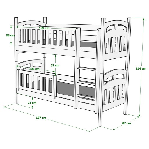 Модель Zuzia Pitrowe являє собою двоярусне колесо з можливістю перетворення на дві незалежні ручки. Модель Zuzia має сучасні деталі у вигляді округлих елементів. Конструкція ліжка виготовлена з високоякісної деревини сосни в поєднанні з міцними меблевими дошками в підголівниках і перилах. Всі елементи виготовлені гранично ретельно, а краї закруглені.