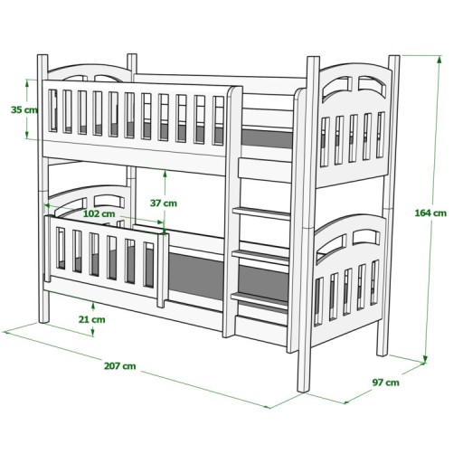 Модель Zuzia Pitrowe являє собою двоярусне колесо з можливістю перетворення на дві незалежні ручки. Модель Zuzia має сучасні деталі у вигляді округлих елементів. Конструкція ліжка виготовлена з високоякісної деревини сосни в поєднанні з міцними меблевими дошками в підголівниках і перилах. Всі елементи виготовлені гранично ретельно, а краї закруглені.