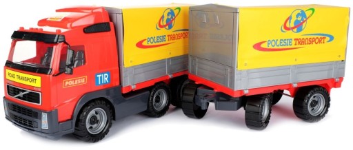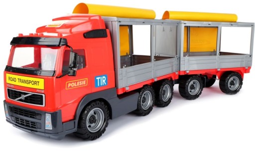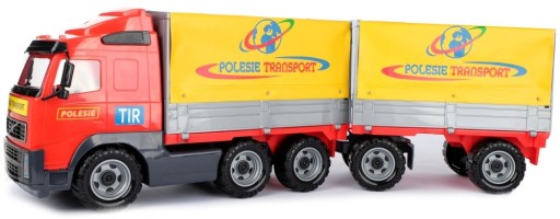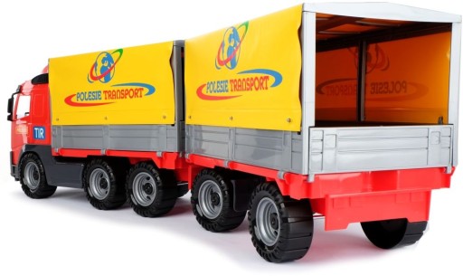 До автомобіля причеплено напівпричіп та причіп. На обох ставили раму з брезентом. Боковини напівпричепа та причепа можна відкрити, а брезент можна підняти. Завдяки рухомому брезенту, що відкривається, машинка відмінно підійде для перевезення іграшок і ігрового транспорту.