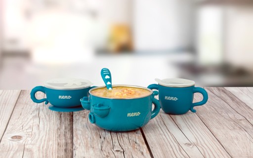- Присоска проти ковзання - набір Neno Polpo оснащений міцною присоскою проти ковзання, яка запобігає ковзанню миски по столу, мінімізуючи ризик опіків або розсипання їжі.