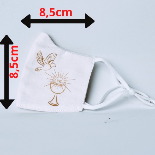 Біла бавовняна маска для причастя з красивими золотими прикрасами.