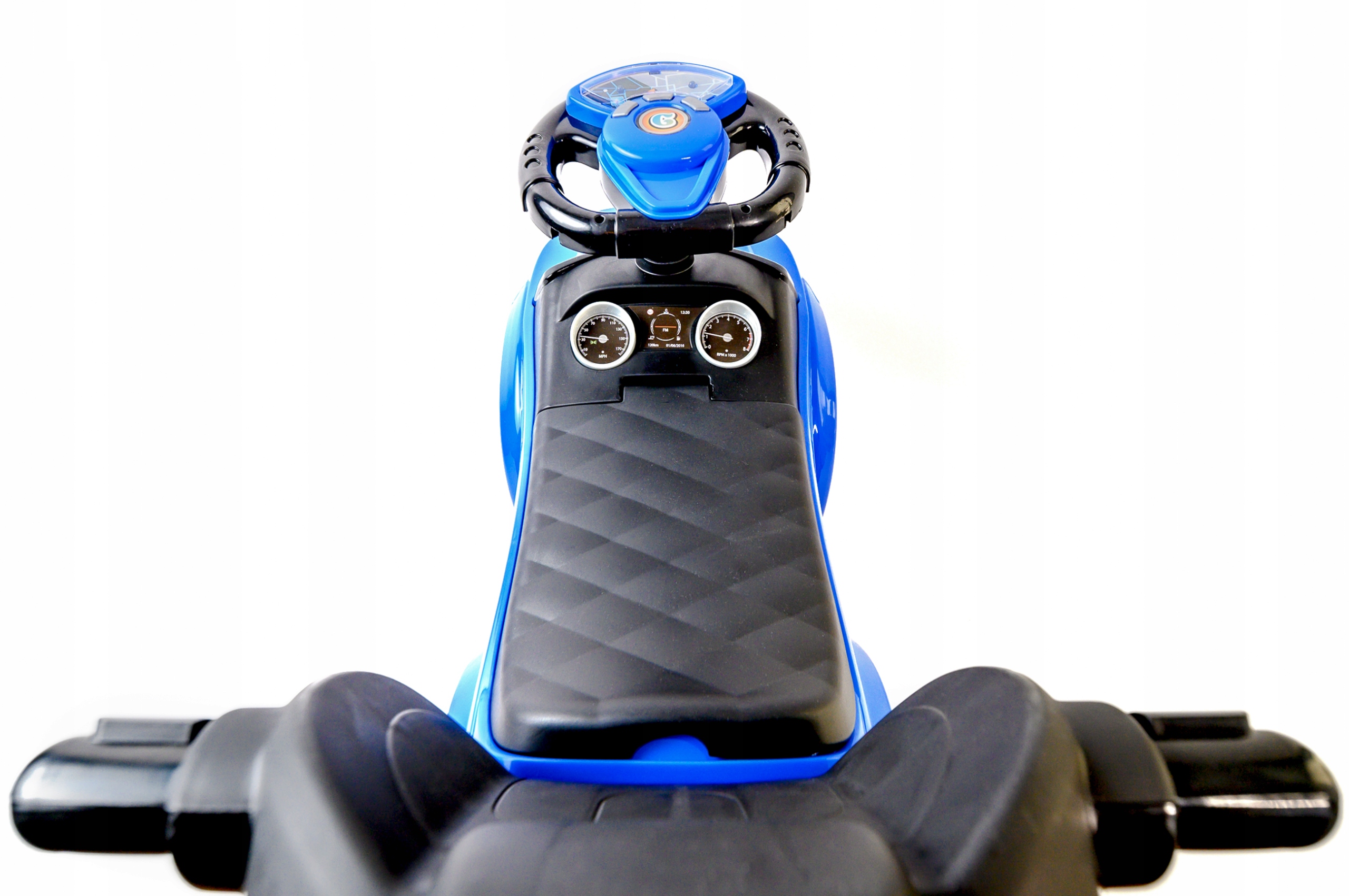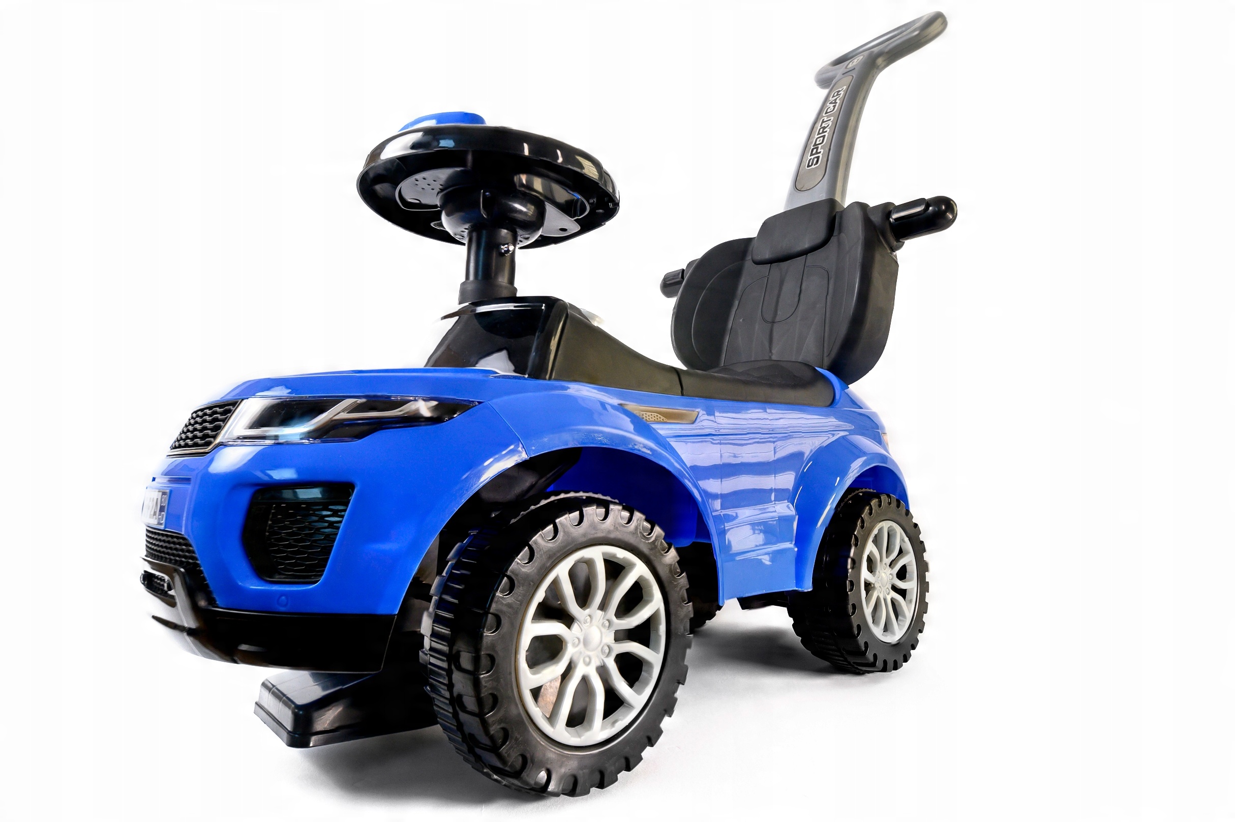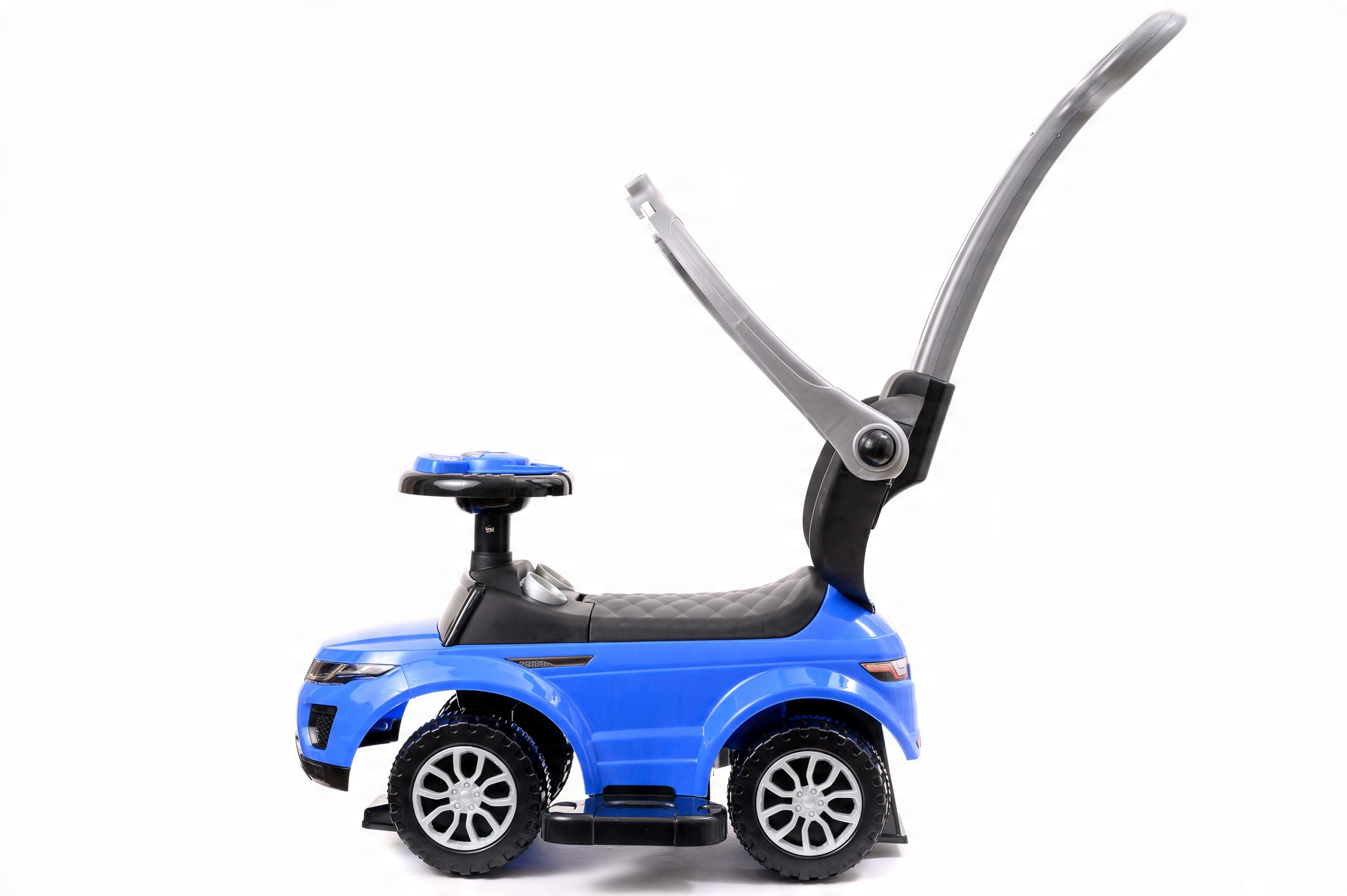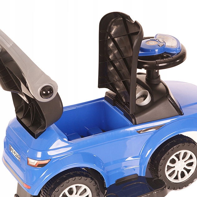 Jeździk w kolorze NIEBIESKIM z rączką przeznaczony dla maluchów powyżej pierwszego roku życia.