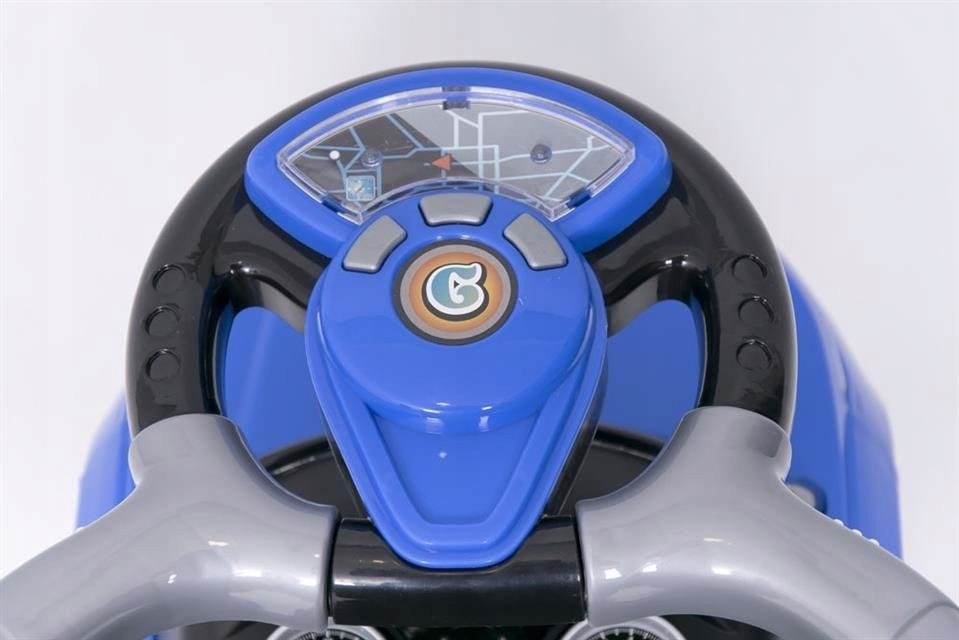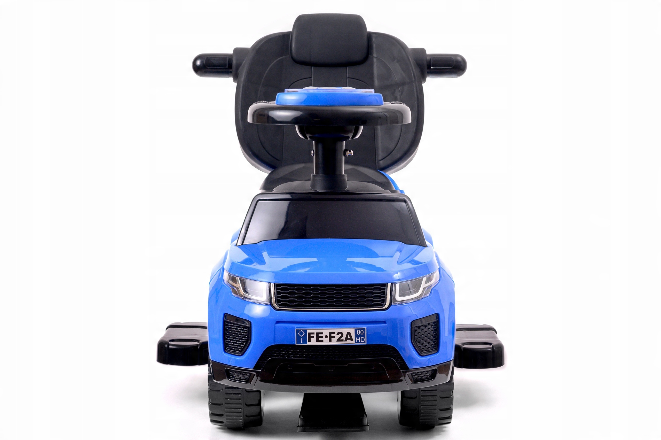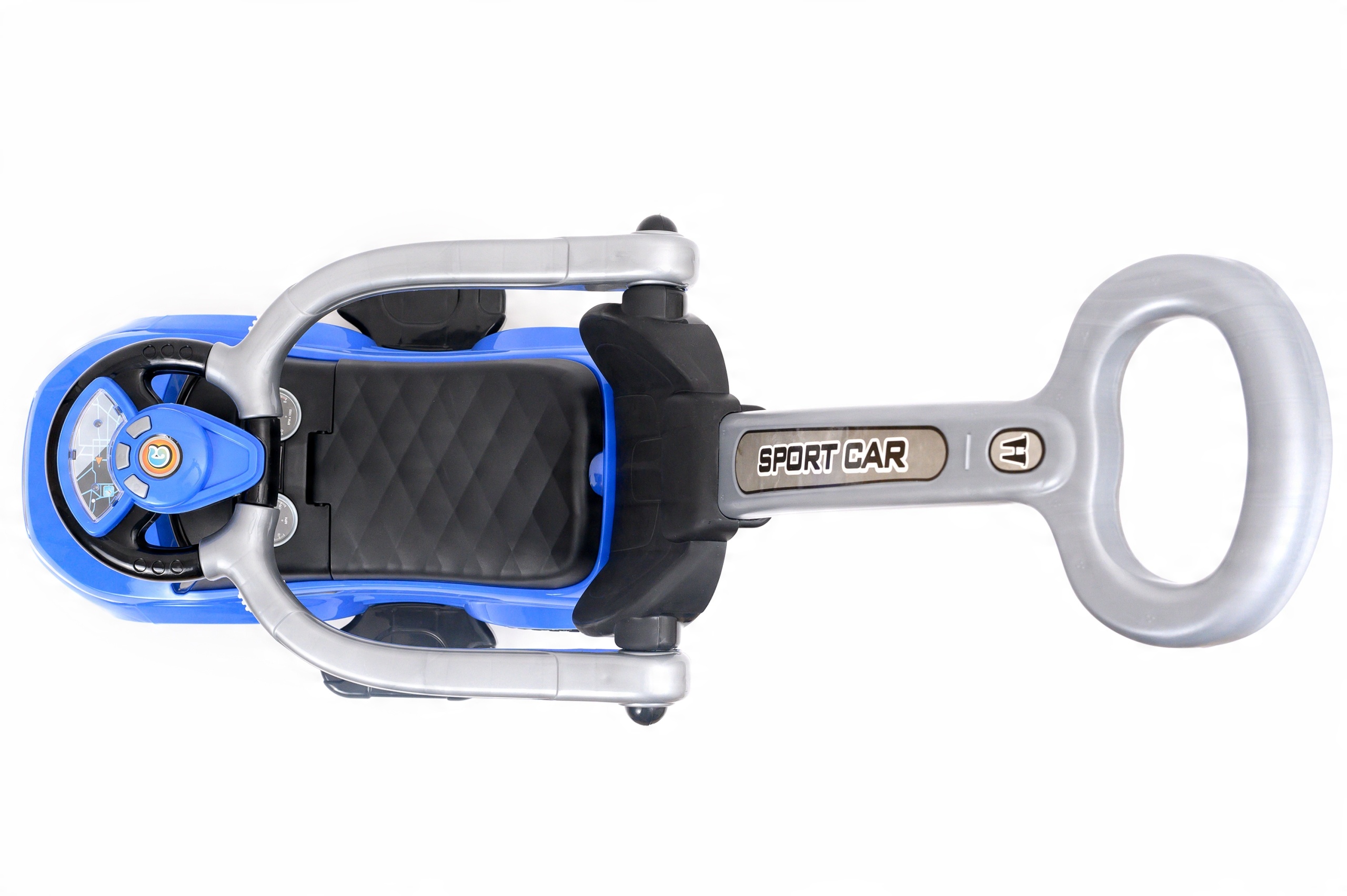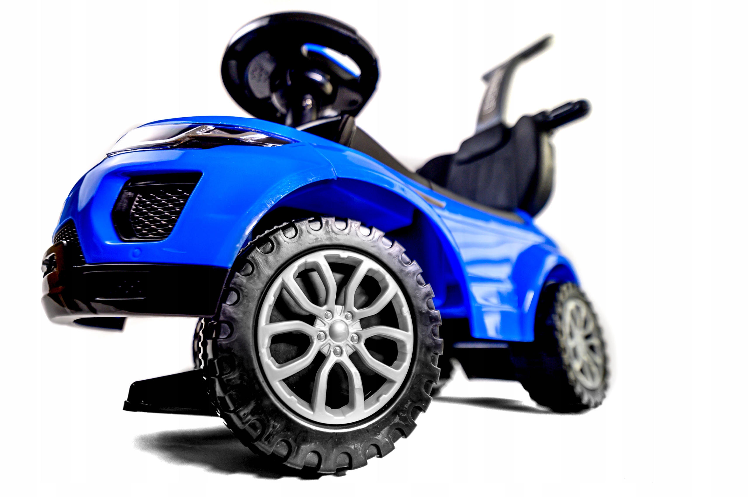 Jeździk w kolorze NIEBIESKIM z rączką przeznaczony dla maluchów powyżej pierwszego roku życia.