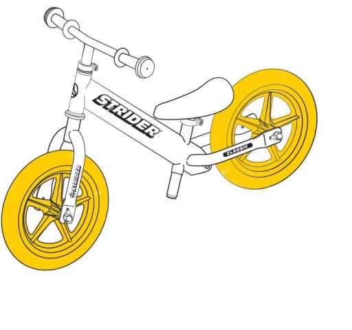 Лише на шинах STRIDER з пінопласту, які є надзвичайно легкими та міцними та забезпечують комфортну їзду. Вони не вимагають закачування.