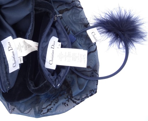 верх сукні з оксамиту / вишитий логотип Dior / , низ тюль з тисненим малюнком / 55% поліестер, 34% поліамід, 11% віскоза / , етикетка Christian Dior