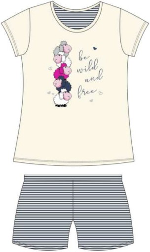 Піжама-двійка для дівчинки з якісної натуральної бавовни. Футболка з коротким рукавом і круглим вирізом кольору екрю. У центральній частині відбиток п'яти різнокольорових овець і напис: «Будь диким і вільним». Шорти мають широкий еластичний пояс. По всій поверхні тканини зображено чорно-білий візерунок у смужку. Це виключно комфортна дівоча білизна, ніжна до шкіри. Він ідеально підійде для теплих весняних і літніх вечорів.