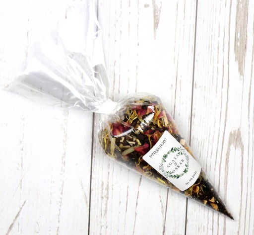 Целофановий конуснаповнений різнокольоровим листовим чаєм на вибір.Все це включає в себе декоративну кольорову наклейку в обраній темі.