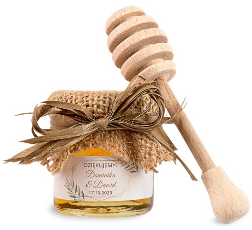 40 мл банки, наповнені справжнім медом, як подяка дерев'яною ложкою та готовим декором